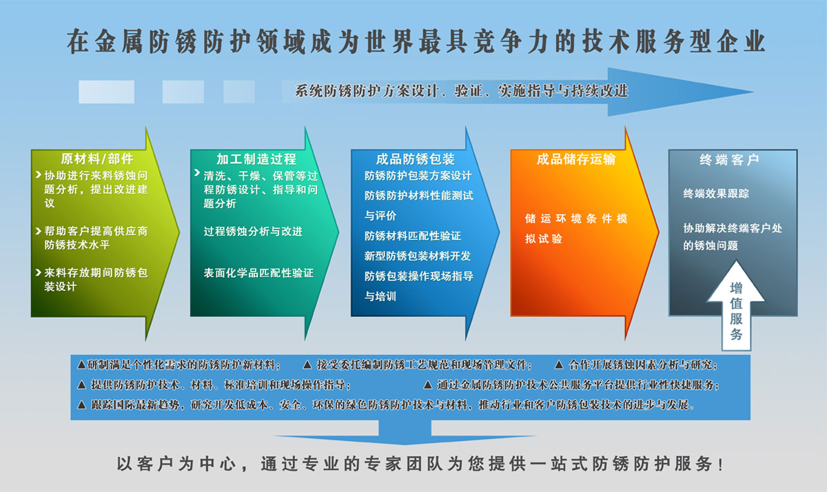 通過一站式、標準化、差異化、增值化的服務(wù)來降低客戶的心理成本和使用成本,最終提高客戶的收益,使沈陽防銹服務(wù)“超越客戶期望,超越行業(yè)標準”,成為防銹業(yè)服務(wù)的旗艦品牌。