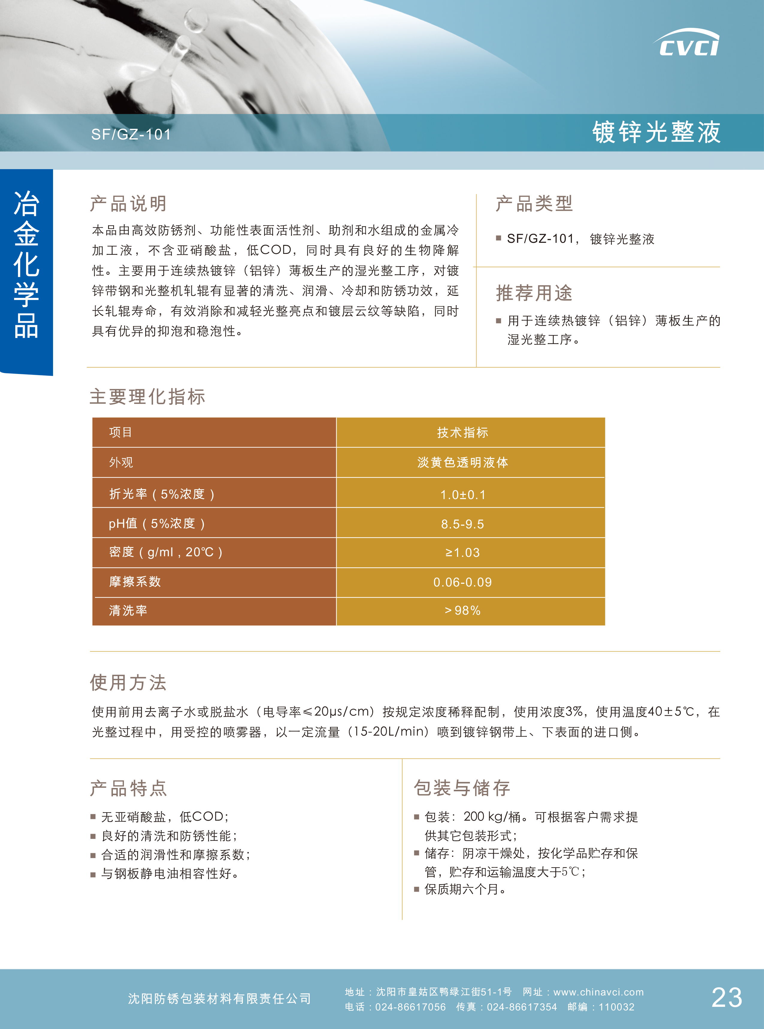 由高效防銹劑、功能性表面活性劑、助劑和水組成的金屬冷加工液,不含亞硝酸鹽,低COD,同時(shí)具有良好的生物降解性。主要用于連續(xù)熱鍍鋅(鋁鋅)薄板生產(chǎn)的濕光整工序,對(duì)鍍鋅帶鋼和光整機(jī)軋輥有顯著的清洗、潤(rùn)滑、冷卻和防銹功效,延長(zhǎng)軋輥壽命,有效消除和減輕光整亮點(diǎn)和鍍層云紋等缺陷,同時(shí)具有優(yōu)異的抑泡和穩(wěn)泡性。