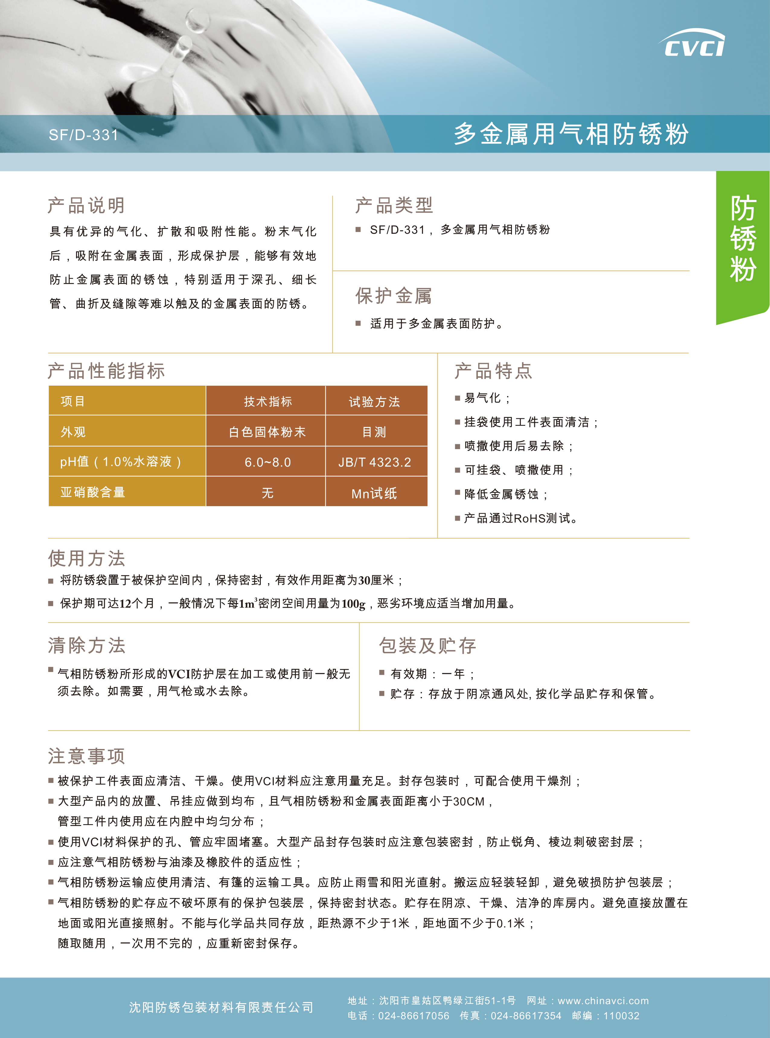 產(chǎn)品說明:多金屬用氣相防銹粉,具有優(yōu)異的氣化、擴散和吸附性能。粉末氣化后,吸附在被保護金屬表面,形成保護層,能夠非常有效地防止金屬表面的銹蝕,特別適用于深孔、細(xì)長管、曲折及縫隙等難以觸及的金屬表面的防銹。
