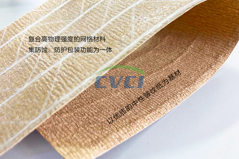 加網(wǎng)復合紙以優(yōu)質(zhì)的中性皺紋紙為基材,按結構和特性分為皺紋加網(wǎng)復合紙和阻隔型皺紋加網(wǎng)復合紙。產(chǎn)品可添加氣相緩蝕劑,制作成加網(wǎng)型復合氣相防銹紙。